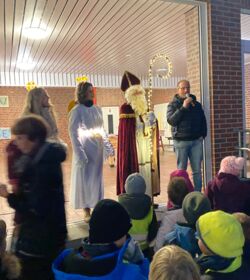 In einer beleuchteten Kutsche fährt der heilige Mann begleitet vom Kutscher und zwei Engelchen auf dem Schulhof vor. Der Nikolaus begrüßt die gespannten Kinder, die ihre Freude durch Gedichte, Lieder und Tänze zum Ausdruck bringen.