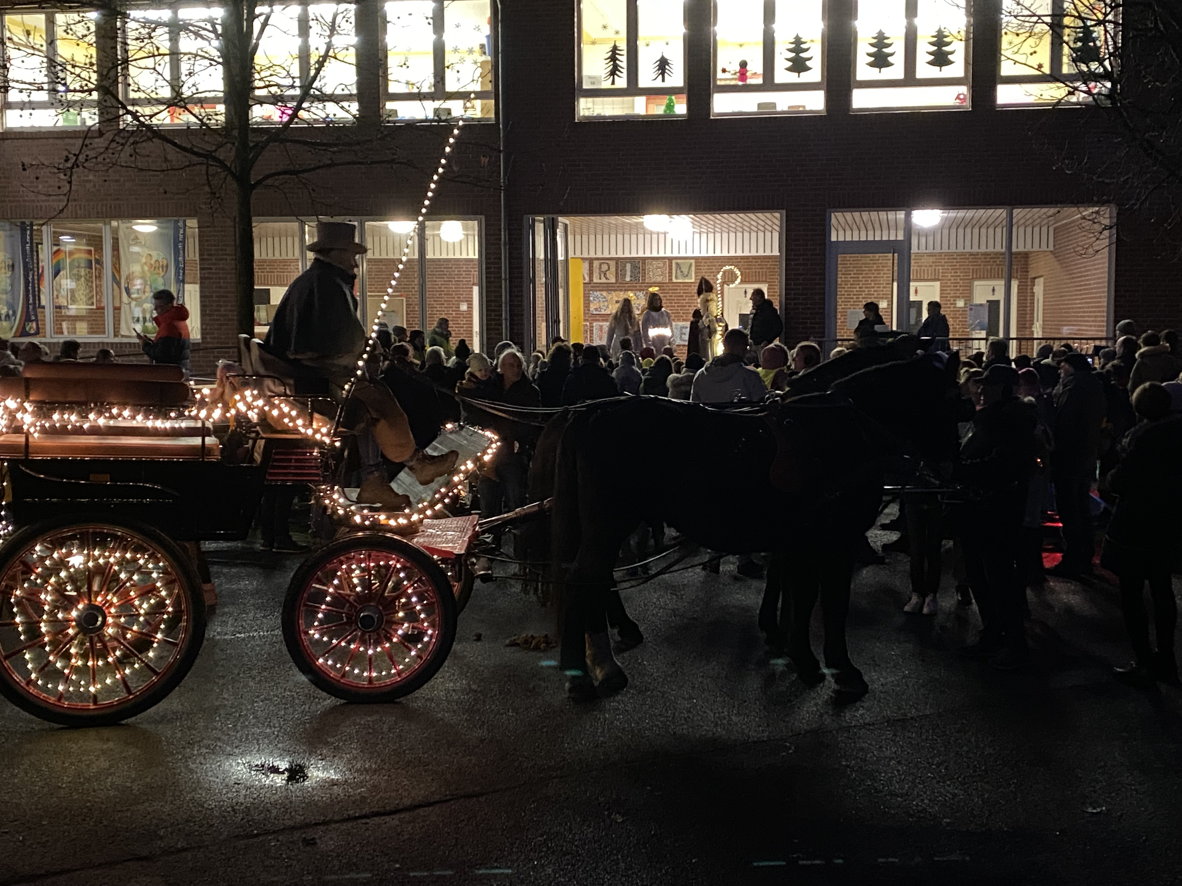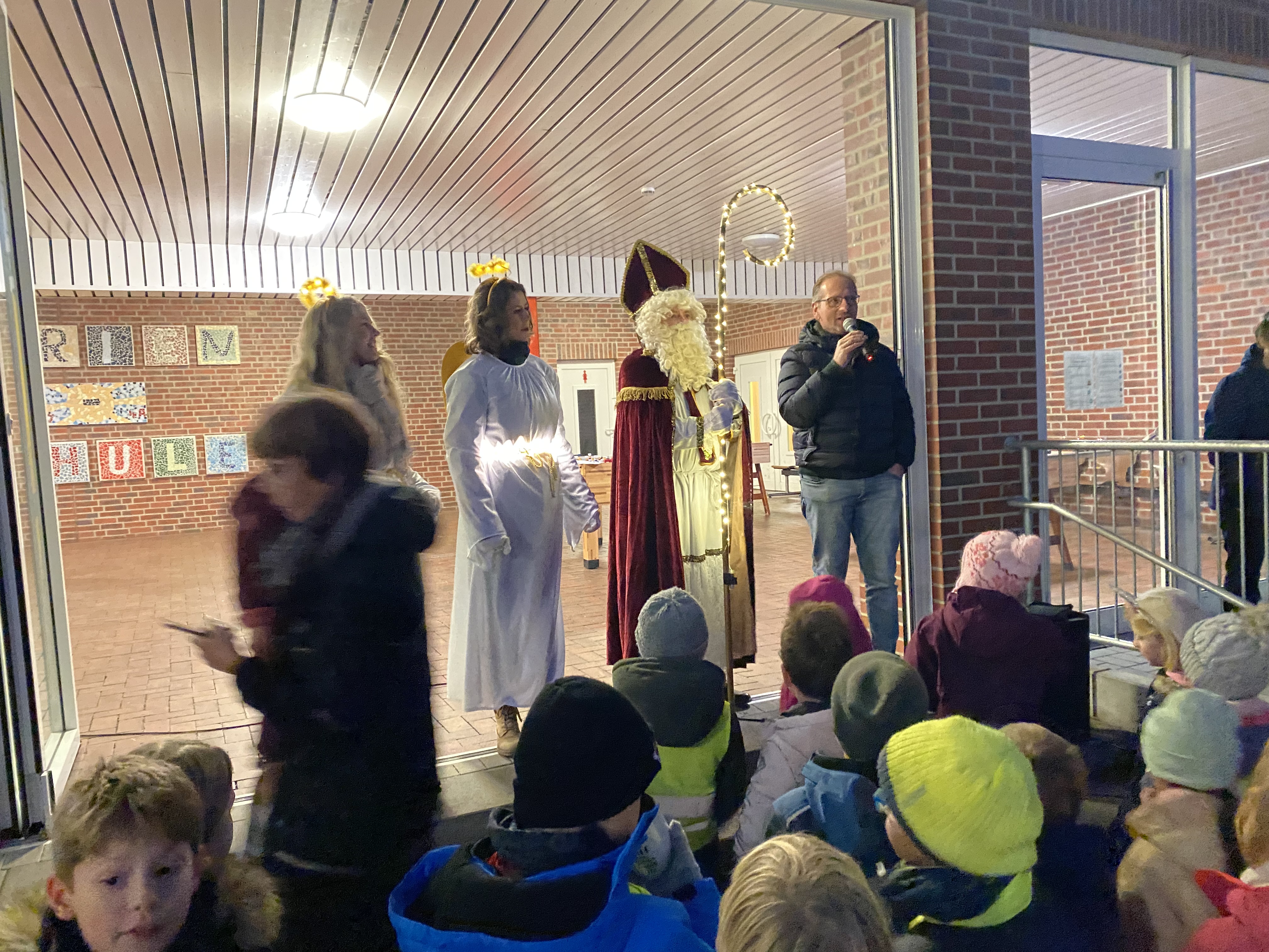 In einer beleuchteten Kutsche fährt der heilige Mann begleitet vom Kutscher und zwei Engelchen auf dem Schulhof vor. Der Nikolaus begrüßt die gespannten Kinder, die ihre Freude durch Gedichte, Lieder und Tänze zum Ausdruck bringen.